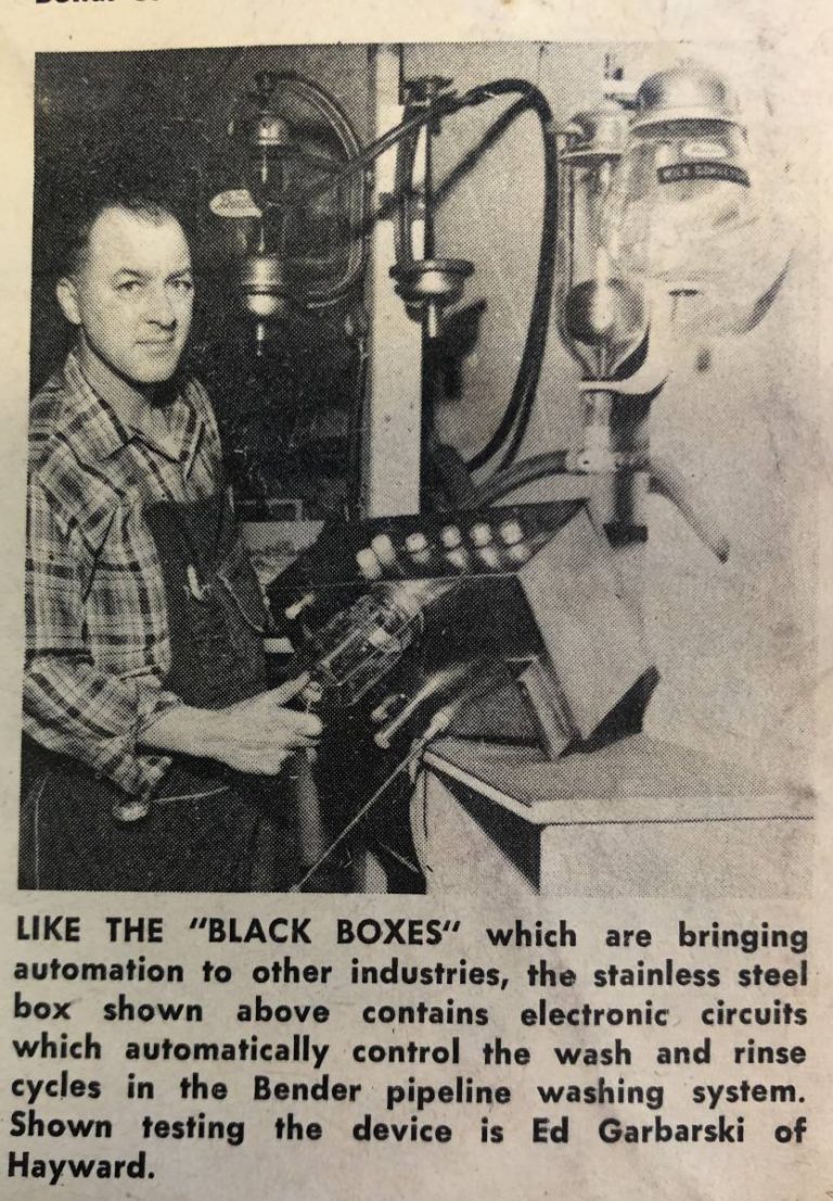In keeping with the growing dairy farm industry, Lloyd developed some of the first automated clean-in-place or CIP milk pipeline systems. The systems were constructed similarly to automatic dishwashers with mechanical fill, drain, soap dispensing, and wash cycles. Bender continues to manufacture these types of washing systems.